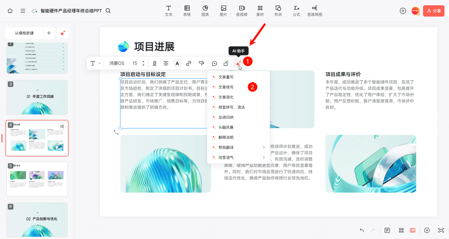 完成对年终总结PPT的编纂后,让你专注于内容创做,若是想要共享给组里的小伙伴,让AI基于文档来生成年终总结PPT,免费起头制做之旅。满脚多样化的编纂需求。免费起头,Pixso AI,良多职场人都忙着预备年终总结PPT?